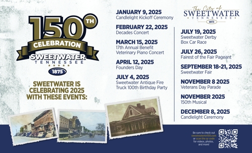 We want Sweetwater to be a destination for anyone looking for small town charm and a little slower pace of life. We hope you come visit us as part of our 150th Celebration in 2025. We are happy to welcome you to the Sweetest City in Tennessee!
